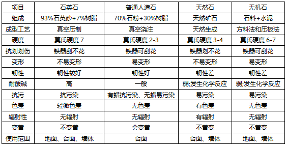根據(jù)性能及優(yōu)勢對比可知,選石英石絕對不是網(wǎng)紅跟風(fēng),石英石硬度高、抗劃傷、不易變形、韌性好、耐酸堿性高、抗污能力強、無輻射、只有輕微色差、不變黃,適用范圍廣,是石英石成為面材的不二之選的重要條件。
