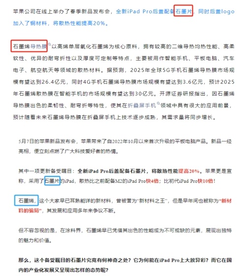 中國粉體網(wǎng)訊 5月7日晚,蘋果公司在線上舉辦了春季新品發(fā)布會,發(fā)布了iPad Pro、iPad Air、Apple Pencil Pro三款主要硬件產(chǎn)品。其中,全新iPad Pro后蓋配備石墨片,同時后蓋logo加入了銅材料,將散熱性能提高了20%。