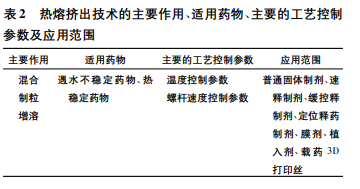有關(guān)熱熔擠出技術(shù)的主要作用、適用藥物、主要的工藝控制參數(shù)及應(yīng)用范圍等簡要總結(jié)見表。