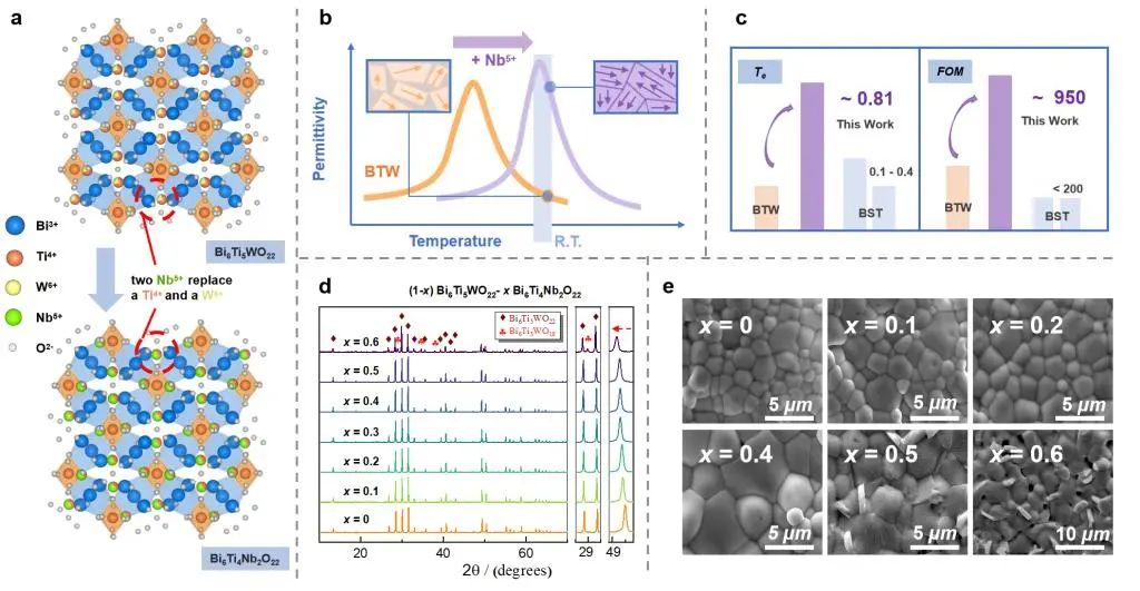針對這一難題,西安交通大學(xué)電信學(xué)部電子科學(xué)與工程學(xué)院周迪教授團(tuán)隊在此前探索的新型高介低損Bi6Ti5WO22陶瓷體系的基礎(chǔ)之上,通過引入離子半徑更大的Nb5+離子取代Ti4+/W6+離子,設(shè)計并順利制備出組分為(1-x)Bi6Ti5WO22 -xBi6Ti4Nb2O22的一系列固溶體陶瓷。