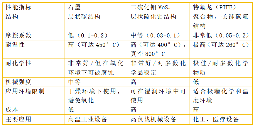 石墨、二硫化鉬和特氟龍(PTFE)三種固體潤滑劑的主要性能對比