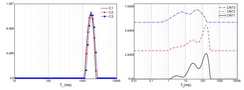左圖:炭黑漿料的T2譜,右圖:CNT漿料的T2譜