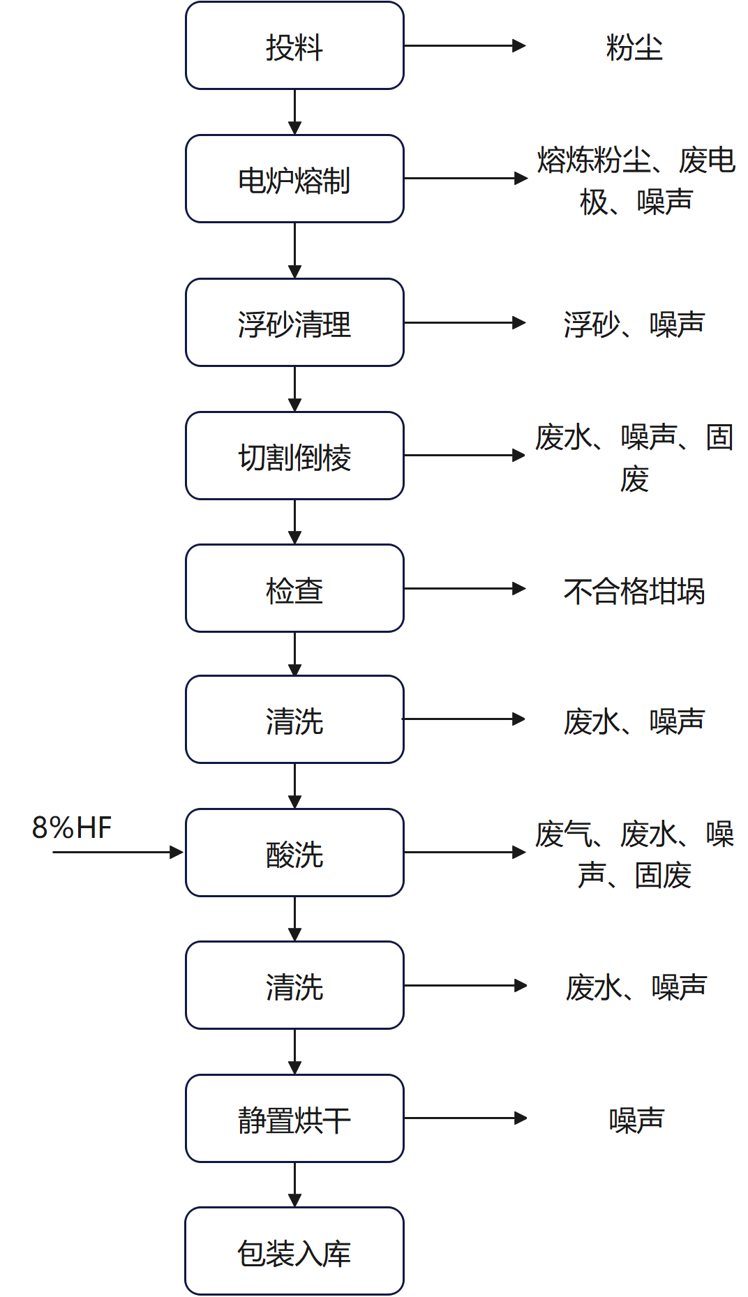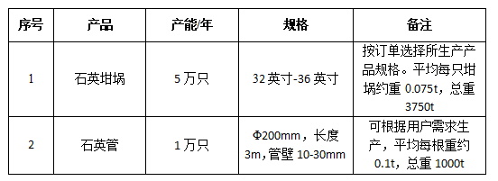 項目原料為40-100目高純石英砂,主要生產(chǎn)太陽能和半導體直拉單晶硅用石英坩堝及石英管生產(chǎn)線,設置坩堝生產(chǎn)車間,以高純石英砂為原料,經(jīng)熔制爐熔制坩堝毛坯、浮砂清理、切割倒棱、酸洗、清洗、烘干、裝箱入庫等工序制成。