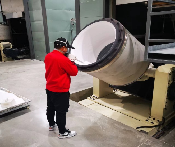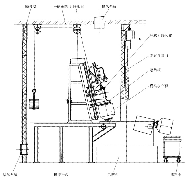 投料:將高純石英砂人工投放至可旋轉(zhuǎn)角度的碳鋼模具內(nèi),利用離心力和成型棒手工成型,將載有碳鋼模具的小車(坩堝熔制爐配套部件)自動移動至隔音密閉的熔制爐爐體內(nèi)的石墨電極棒處,投料過程耗時約10min。