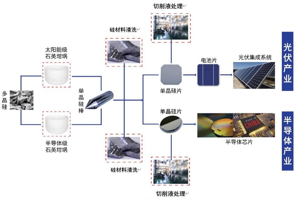 歐晶科技主營(yíng)業(yè)務(wù)(紅色虛線框部分:石英坩堝產(chǎn)品、硅材料清洗服務(wù)、切削液處理服務(wù))