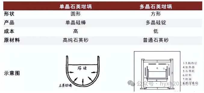 半導(dǎo)體石英坩堝主要用于生長半導(dǎo)體單晶硅,用于制造集成電路、微電子器件等;光伏石英坩堝主要用于生長光伏單晶硅,用于制造太陽能電池、光伏組件等。