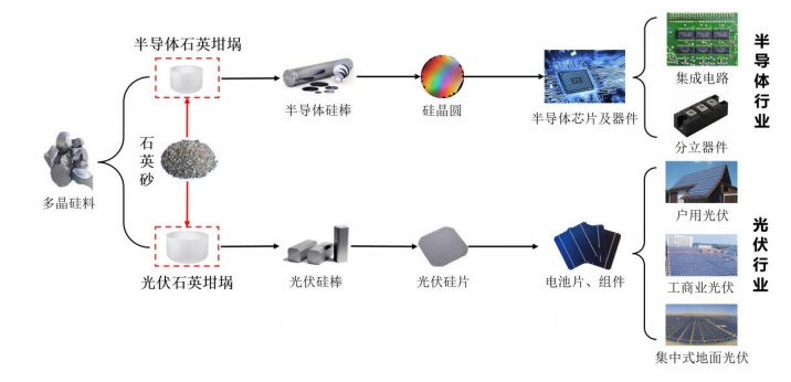 按應(yīng)用,石英坩堝可分為兩大類:半導(dǎo)體(電子級(jí))石英坩堝、光伏(太陽(yáng)能級(jí))石英坩堝。