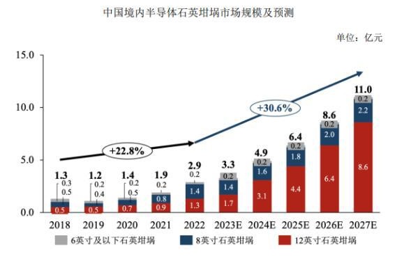 從需求端來看,2022年中國(guó)境內(nèi)半導(dǎo)體石英坩堝需求量占全球需求總量的15.93%。隨著中國(guó)半導(dǎo)體硅片產(chǎn)業(yè)的蓬勃發(fā)展,中國(guó)境內(nèi)半導(dǎo)體石英坩堝市場(chǎng)需求也將快速上升,據(jù)中金企信預(yù)測(cè),2027年中國(guó)境內(nèi)半導(dǎo)體坩堝市場(chǎng)規(guī)模有望從2022年的2.9億元增長(zhǎng)至11億元,年復(fù)合增長(zhǎng)率30.6%。