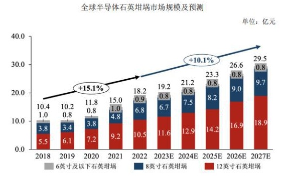 在半導(dǎo)體石英坩堝領(lǐng)域,國(guó)外半導(dǎo)體產(chǎn)業(yè)逐漸轉(zhuǎn)移至國(guó)內(nèi),隨著新能源車、智能電網(wǎng)、自動(dòng)駕駛、人工智能的發(fā)展,8 英寸及 12 英寸半導(dǎo)體硅片出貨量持續(xù)增長(zhǎng),我國(guó)半導(dǎo)體硅片供應(yīng)商開始加碼大硅片產(chǎn)能布局,對(duì)半導(dǎo)體石英坩堝的需求持續(xù)增加,預(yù)計(jì)至 2027 年,全球半導(dǎo)體石英坩堝市場(chǎng)規(guī)模將擴(kuò)大至 29.5 億人民幣,期間年復(fù)合增長(zhǎng)率為 10.1%。目前,國(guó)內(nèi)個(gè)別企業(yè)開展了 32 英寸半導(dǎo)體級(jí)石英坩堝的研發(fā)工作并具備量產(chǎn)能力。