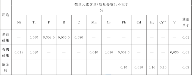 有機(jī)用硅Ni含量要求保持不變,Ti≤0.05%減小到Ti≤0.06%,并新增了Mn、Cr、Pb、V的含量要求,分別為Mn≤0.040、Cr≤0.010、Pb≤0.0010、V≤0.030;