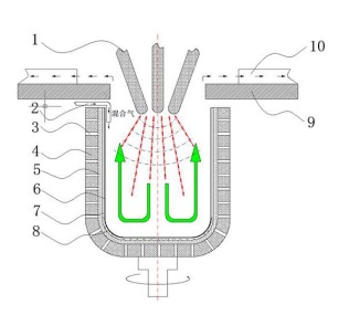 該發(fā)明提供一種半導(dǎo)體級(jí)合成石英坩堝的制備方法,該制備方法包括:對(duì)石英砂成型后的石英坩堝依次進(jìn)行排氣處理、封皮處理、透明層熔制、氣泡層熔制和冷卻;封皮處理、透明層熔制和氣泡層熔制過(guò)程中,水冷板與模具口的距離為50~80mm。該制備方法有效減少外界雜質(zhì)的進(jìn)入,降低外界對(duì)坩堝內(nèi)部熔融環(huán)境的影響,改善了合成石英坩堝R角內(nèi)表面純度高的問(wèn)題。