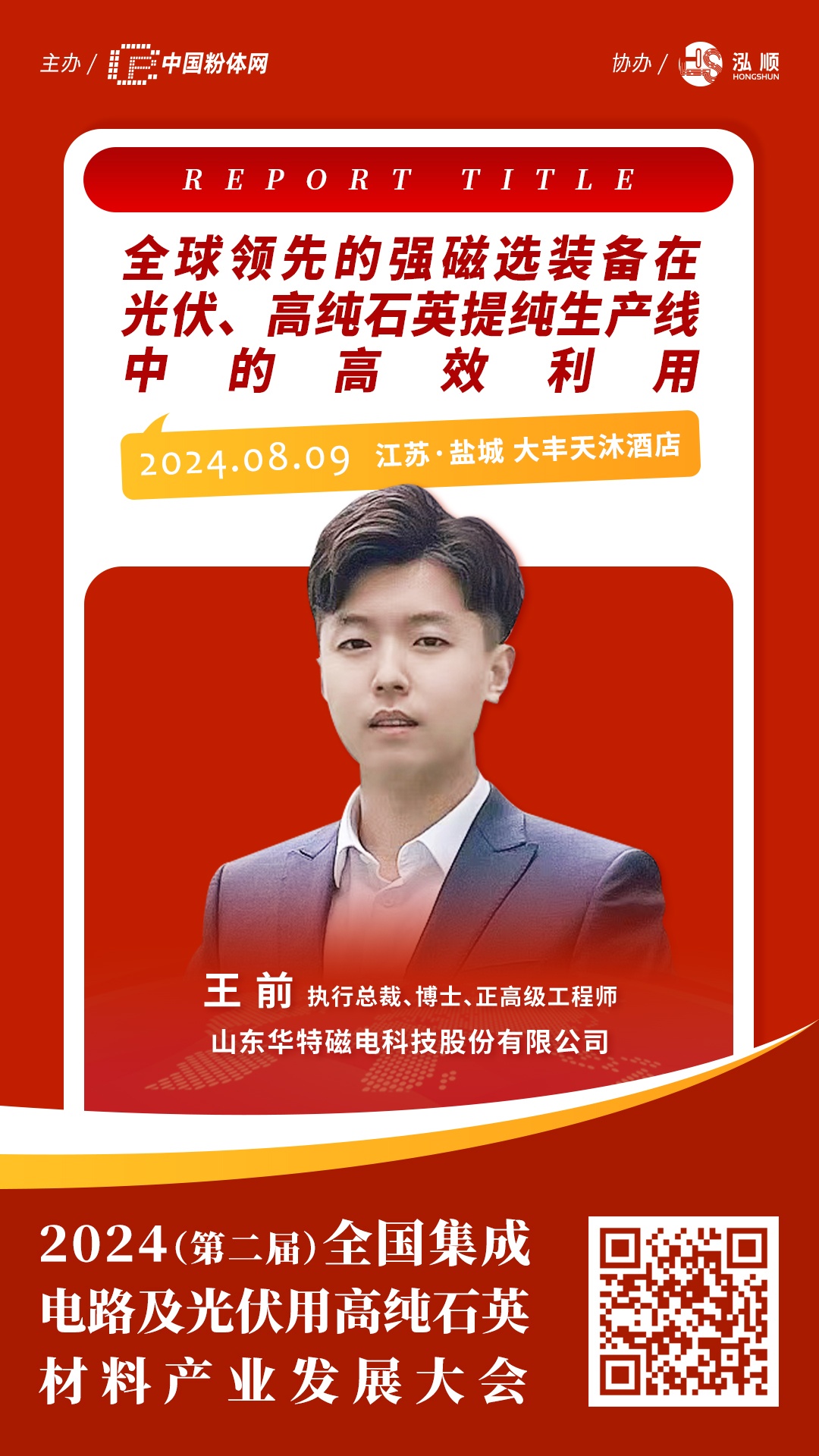2024年8月9日,由中國粉體網(wǎng)主辦的“2024(第二屆)全國集成電路及光伏用高純石英材料產(chǎn)業(yè)發(fā)展大會”將在江蘇鹽城召開,屆時,山東華特磁電科技股份有限公司執(zhí)行總裁王前將做《全球領(lǐng)先的強磁選裝備在光伏、高純石英提純生產(chǎn)線中的高效利用》的報告,屆時,他將詳細(xì)介紹華特磁電磁選裝備在高純石英砂中的應(yīng)用。