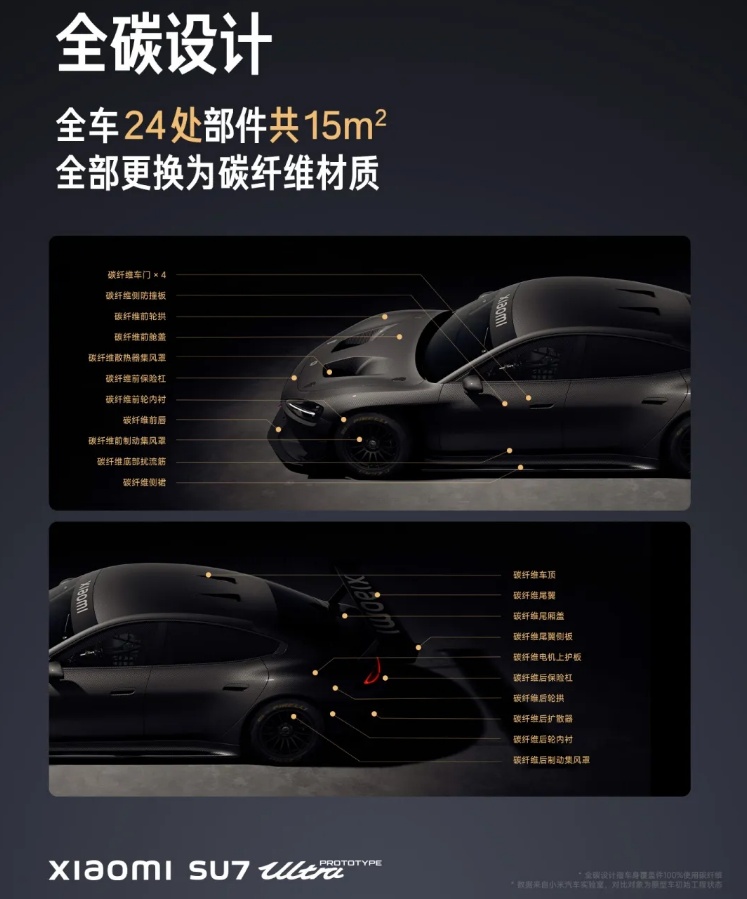 不僅如此,小米SU7最強(qiáng)版本——SU7 Ultra,原型車采用「全碳」設(shè)計(jì),車身覆蓋件100%使用碳纖維材料;全車24處部件共15m2,全部更換為碳纖維材質(zhì)。整車減重到1900kg,甚至輕于部分同尺寸的量產(chǎn)油車。