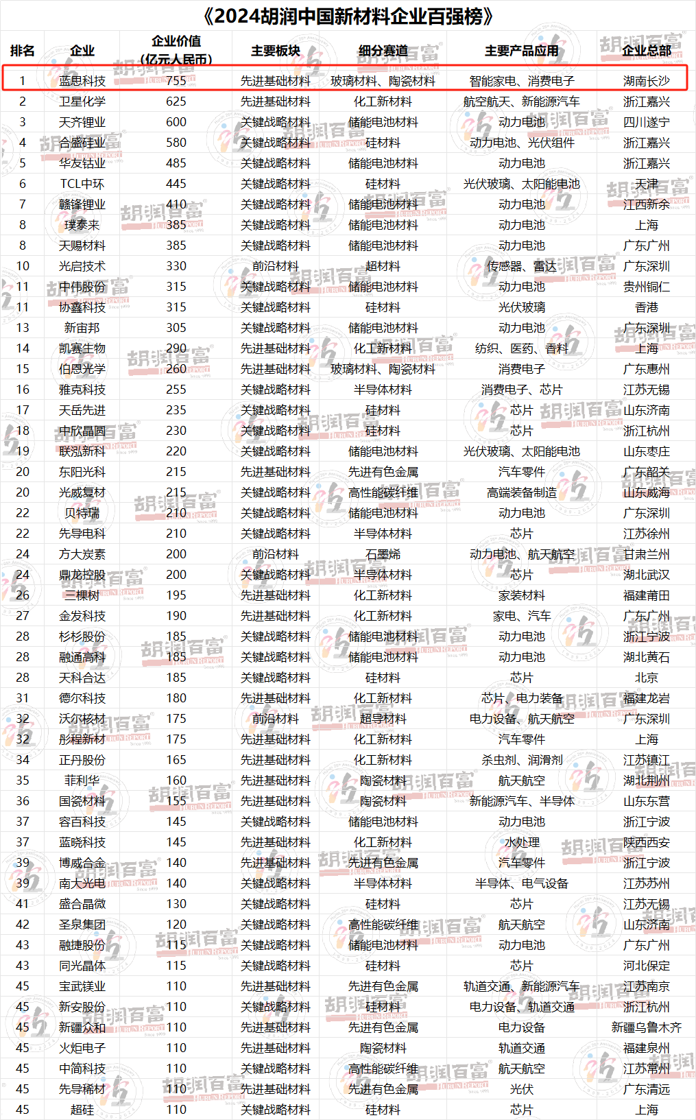 中國粉體網(wǎng)訊 近日,胡潤研究院在2024世界新能源新材料大會上發(fā)布了《2024胡潤中國新材料企業(yè)百強(qiáng)榜》,《新材料百強(qiáng)榜》列出了中國新材料領(lǐng)域最具價值的企業(yè)(非國有企業(yè)),主營玻璃/陶瓷材料的藍(lán)思科技位列第一,國瓷材料、火炬電子等多家陶瓷企業(yè)榜上有名。