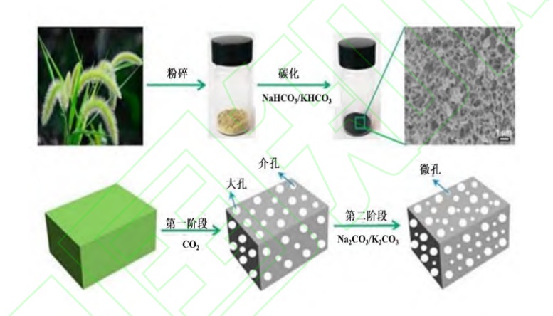 活化法是將碳前驅(qū)體與活化劑混合后在高溫惰性氣體的條件下在碳前驅(qū)體上發(fā)生造孔反應(yīng)的一種方法;罨ǚ譃槲锢砘罨ê突瘜W(xué)活化法,物理活化法包括兩個(gè)步驟:(1)利用高溫(通常 800℃以上)將碳前驅(qū)體進(jìn)行碳化;(2)使用水蒸汽或者二氧化碳作為活化劑與碳前驅(qū)體反應(yīng)達(dá)到造孔的目的。然而物理活化法只發(fā)生在碳材料的表面,活化作用力較弱,因此大多采用化學(xué)活化的方法;瘜W(xué)活化法利用化學(xué)試劑在高溫條件下與碳前驅(qū)體反應(yīng)以達(dá)到造孔的目的。常用的活化試劑有KOH、KHCO3、NaHCO3、H3PO4 和 ZnCl2 等。