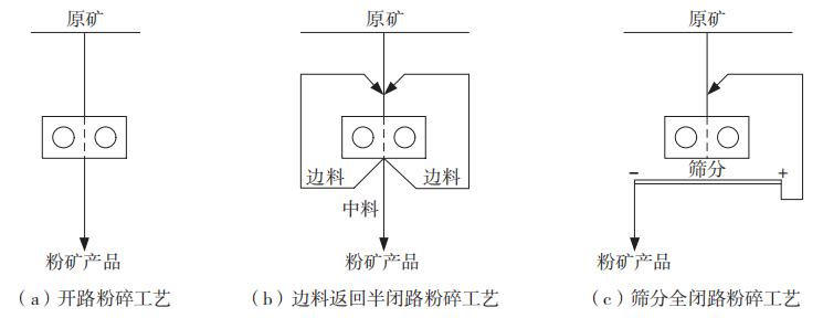 高壓輥磨機(jī)粉碎流程一般包括開路粉碎工藝、邊料循環(huán)全閉路粉碎工藝和篩分全閉路粉碎工藝。