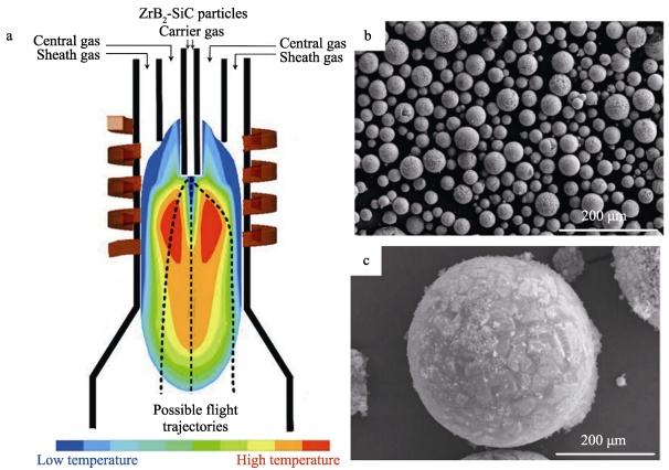 Sun等著重研究了ZrB2-SiC陶瓷復(fù)合粉體材料的球化工藝,利用感應(yīng)等離子球化技術(shù),實(shí)現(xiàn)了ZrB2-SiC球形粉體中裂紋、孔隙等微觀缺陷的有效消除,使粉體材料性能得到提升。
