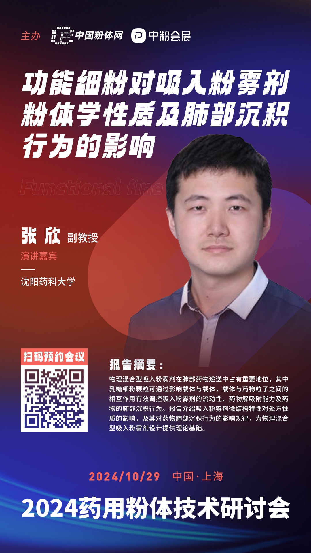 2024年10月29-31日在上?鐕少彆怪行,由北京粉體技術(shù)協(xié)會與柏德英思展覽(上海)有限公司聯(lián)合主辦2024藥用粉體技術(shù)研討會。屆時來自沈陽藥科大學(xué)副教授張欣將為大家?guī)怼?strong>功能細粉對吸入粉霧劑粉體學(xué)性質(zhì)及肺部沉積行為的影響》的主題報告。報告主講人將介紹吸入粉霧劑微結(jié)構(gòu)特性對處方性質(zhì)的影響,及其對藥物肺部沉積行為的影響規(guī)律,為物理混合型吸入粉霧劑設(shè)計提供理論基礎(chǔ)。