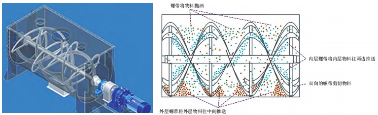 臥式螺帶混合機(jī)的混合原理是強(qiáng)制剪切攪拌型混合,主要由混合倉、攪拌器、驅(qū)動裝置三個(gè)基本部分構(gòu)成,工作時(shí),外螺旋帶在動力的驅(qū)動下,把物料從U型倉兩端向中央地帶推動,內(nèi)螺旋帶把物料從中間向兩端推動,從而形成對流混合;旌蠙C(jī)出料口設(shè)置在混合機(jī)筒體底部中央,外層螺旋帶的蝸旋結(jié)構(gòu)與主軸旋轉(zhuǎn)方向配合,將筒壁內(nèi)側(cè)的物料驅(qū)趕至中央出料口處出料,從而確保筒體內(nèi)物料出料完全。