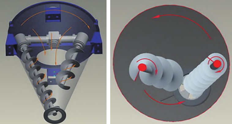 雙螺旋錐形混合設(shè)備憑借內(nèi)部懸臂上的兩根非對稱螺旋在繞自身軸線上自轉(zhuǎn)的同時(shí),由懸臂驅(qū)動,繞筒體中心軸旋轉(zhuǎn)形成公轉(zhuǎn)。