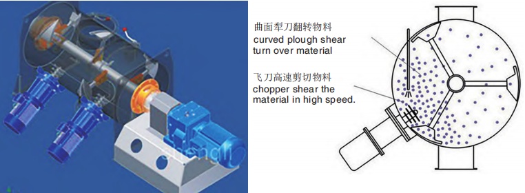 犁刀式混合機(jī)通常采用單軸式攪拌結(jié)構(gòu),主軸上連續(xù)錯(cuò)位安裝多組犁刀式攪拌器,此結(jié)構(gòu)可保證運(yùn)轉(zhuǎn)時(shí),產(chǎn)生不間斷式的漩渦離心作用力,最大程度上避免攪拌死角。設(shè)備工作時(shí),結(jié)團(tuán)性物料通過在犁刀混料機(jī)內(nèi)安裝的高速飛刀,結(jié)合犁刀攪拌器攪拌物料時(shí)形成的對流循環(huán)作用,對物料進(jìn)行打散、分離。高速飛刀通常安裝于犁刀混料機(jī)筒,在攪拌時(shí),物料受犁刀驅(qū)趕至飛刀有效范圍,飛刀進(jìn)行高速剪切。