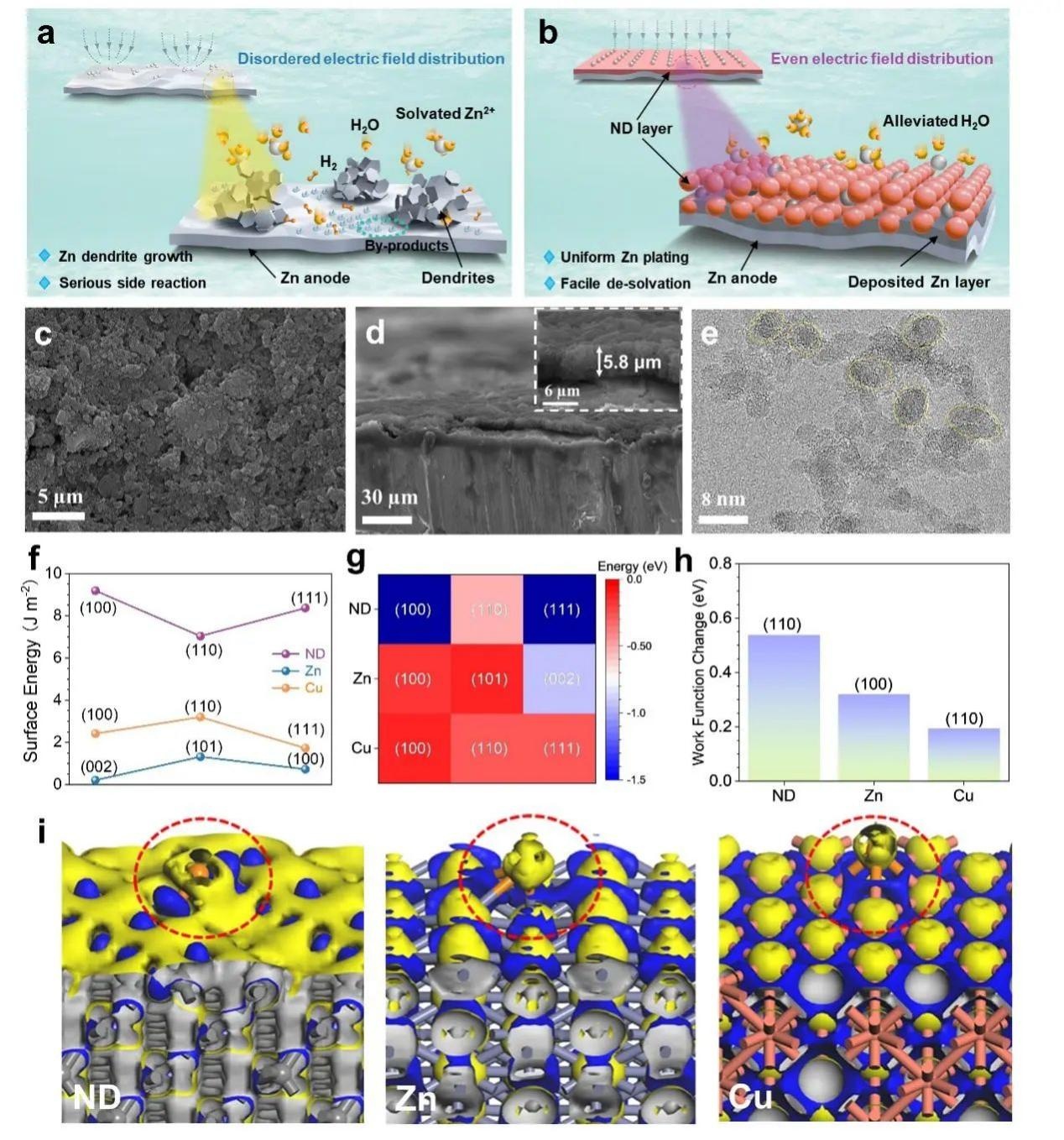 中國粉體網(wǎng)訊 近期,香港城市大學(xué)的張文軍教授和洪果教授攜手香港理工大學(xué)的黃渤龍教授共同展開合作,精心設(shè)計并成功制備出一種多功能納米金剛石保護涂層。該涂層在水系鋅離子電池中,對鋅枝晶的生長以及析氫反應(yīng)起到了顯著的抑制作用,充分展現(xiàn)出極為優(yōu)異的循環(huán)穩(wěn)定性。相關(guān)成果以“Multifunctional Nanodiamond Interfacial Layer for Ultra-Stable Zinc-Metal Anodes”為題發(fā)表在Advanced Energy Materials 期刊上。