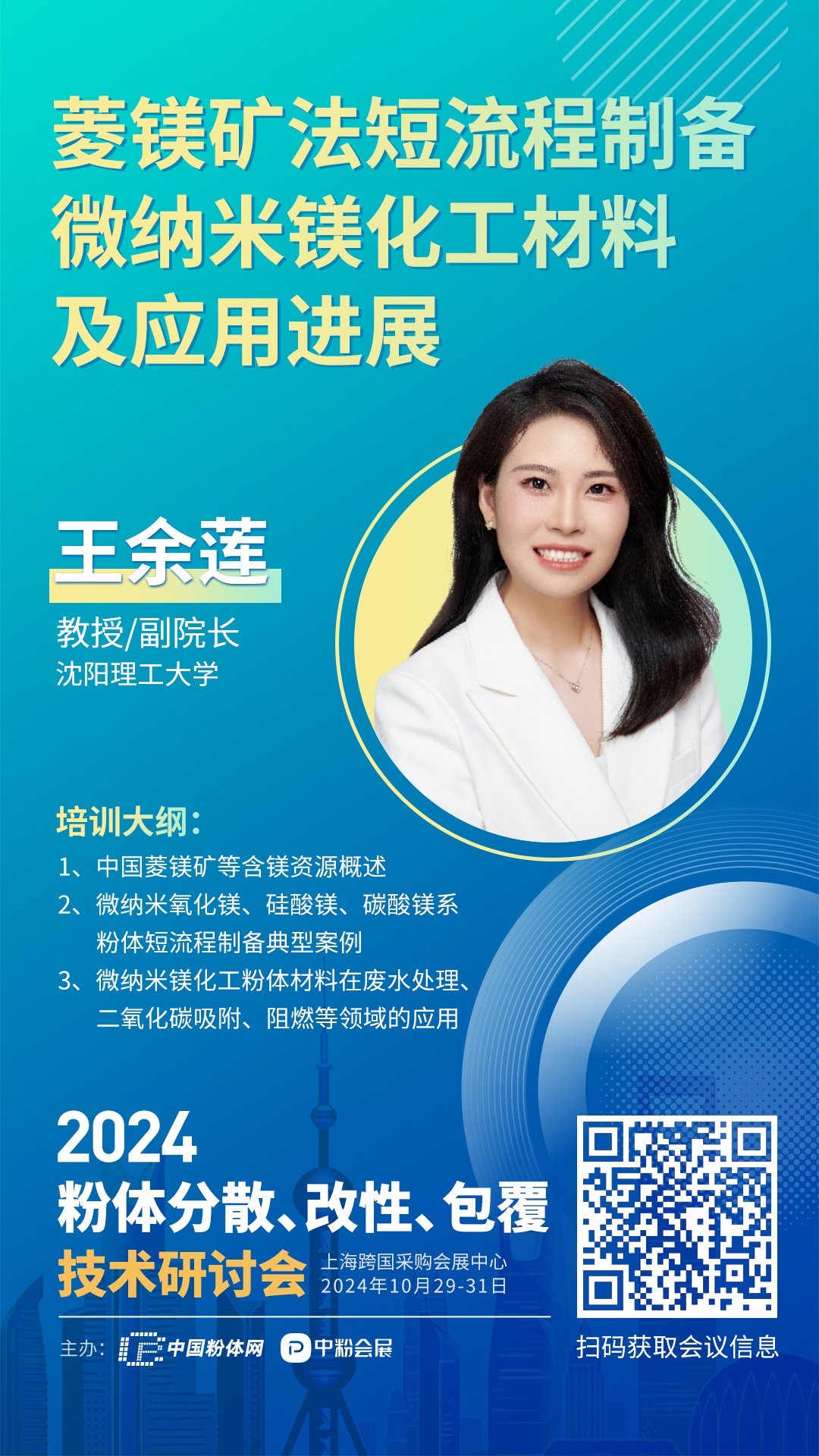 2024年10月30日在上?鐕(guó)采購(gòu)會(huì)展中心,由北京粉體技術(shù)協(xié)會(huì)與柏德英思展覽(上海)有限公司聯(lián)合主辦“2024粉體分散、改性、包覆技術(shù)研討會(huì)”。屆時(shí)沈陽(yáng)理工大學(xué)王余蓮教授將作《菱鎂礦法短流程制備微納米鎂化工材料及應(yīng)用進(jìn)展》報(bào)告,為參會(huì)嘉賓分享菱鎂礦等含鎂資源概況,講解微納米氧化鎂、硅酸鎂、碳酸鎂等粉體短流程制備典型案例及應(yīng)用研究進(jìn)展等內(nèi)容。