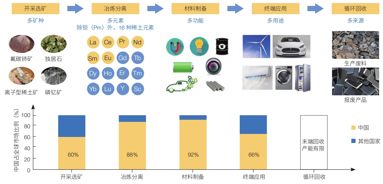 中國(guó)稀土產(chǎn)業(yè)鏈各階段在全球市場(chǎng)中的占比