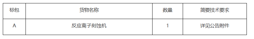 山東大學(xué)反應(yīng)離子刻蝕機(jī) 招標(biāo)項(xiàng)目的潛在投標(biāo)人應(yīng)在山東大學(xué)招標(biāo)采購(gòu)管理系統(tǒng)獲取招標(biāo)文件,并于2024年10月30日 09點(diǎn)00分(北京時(shí)間)前遞交投標(biāo)文件。