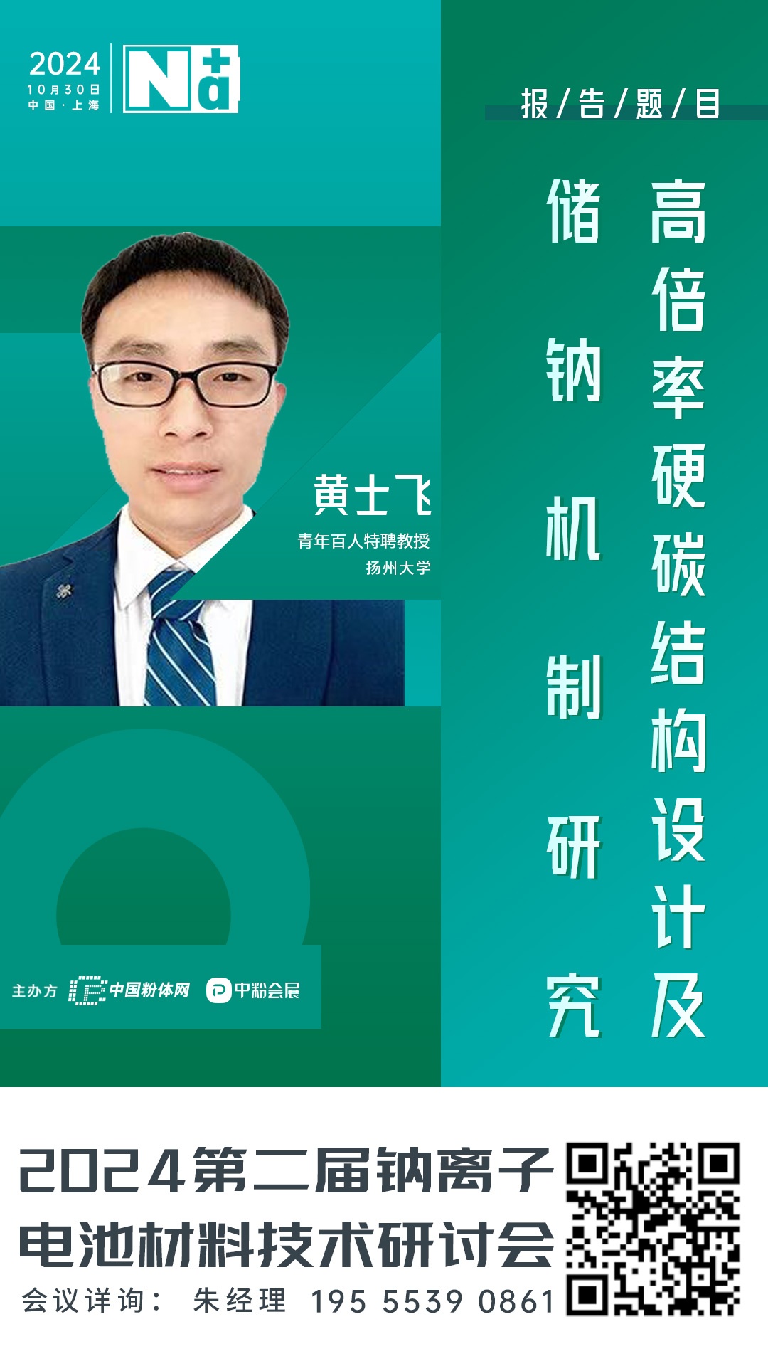 2024年10月29-31日在上?鐕少彆怪行,由北京粉體技術協(xié)會與柏德英思展覽(上海)有限公司聯(lián)合主辦2024第二屆鈉離子電池材料技術研討會。屆時,來自揚州大學的黃士飛教授將作題為《高倍率硬碳結構設計及儲鈉機制研究》的報告。