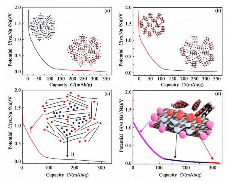 圖:硬碳材料儲鈉機理模型(a)插層-填孔機理模型;(b)吸附-插層機理模型;(c)吸附-填充機理模型;(d)吸附-插層-填孔機理模型