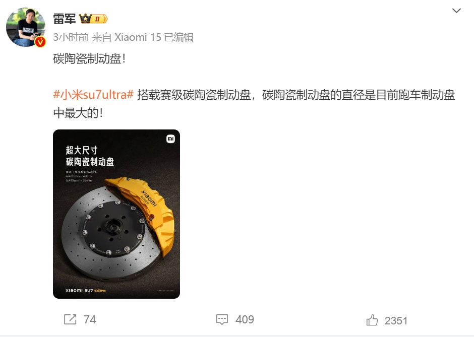 中國粉體網(wǎng)訊 10月28日,小米董事長兼CEO雷軍在微博透露,小米SU7 Ultra量產(chǎn)版搭載賽級碳陶瓷制動盤,“碳陶瓷制動盤的直徑是目前跑車制動盤中最大的!”