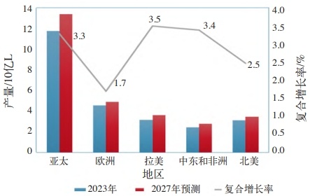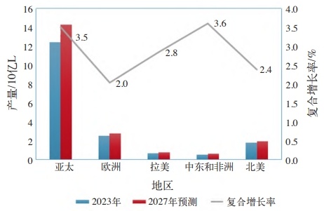 需求端看,2023年全球涂料需求約470億L,市場(chǎng)規(guī)模約1970億美元,預(yù)計(jì)到2027年將增長(zhǎng)至530億L,復(fù)合年均增長(zhǎng)率3.1%,市場(chǎng)規(guī)模約2470億美元,復(fù)合年均增長(zhǎng)率5.8%;地域端看,市場(chǎng)主要集中在亞太地區(qū),同時(shí),增速也遠(yuǎn)高于其他區(qū)域。