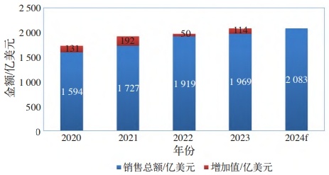 2020-2024年全球涂料銷(xiāo)售額增長(zhǎng)及絕對(duì)值增長(zhǎng)(預(yù)測(cè))