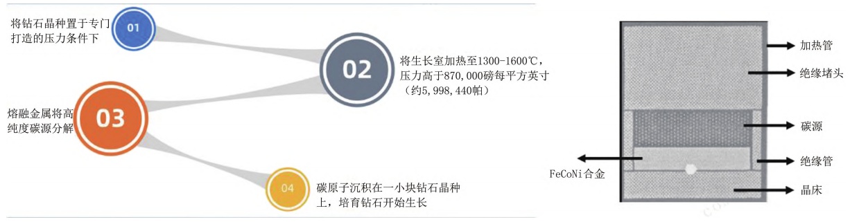 高溫高壓法(HTHP)是以石墨粉、金屬觸媒粉為主要原料,通過液壓裝置保持恒定的超高溫、高壓條件來模擬天然金剛石結晶條件和生長環(huán)境合成出金剛石晶體。