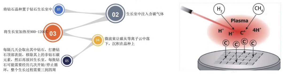 化學氣相沉積法(CVD)是含碳氣體和氫氣混合物在高溫和低于標準大氣壓的壓力下被激發(fā)分解,形成活性金剛石碳原子,并通過控制沉積生長條件促使活性金剛石碳原子在基體上沉積交互生長成金剛石單晶。