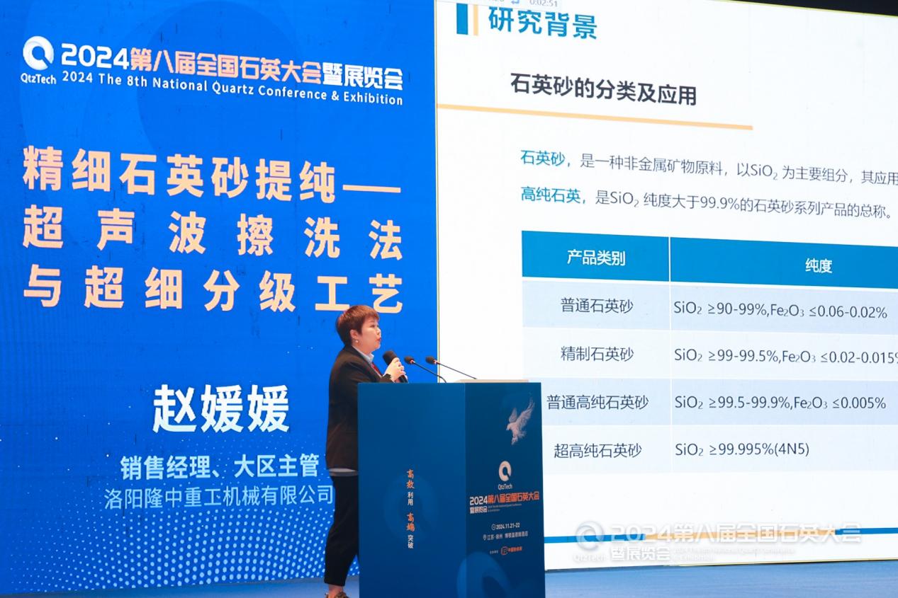 洛陽隆中重工機械有限公司銷售經(jīng)理/大區(qū)主管趙媛媛作《精細石英砂提純一超聲波擦洗法與超細分級工藝》報告