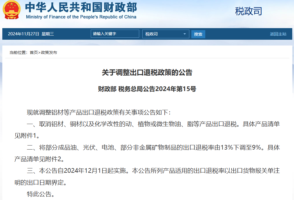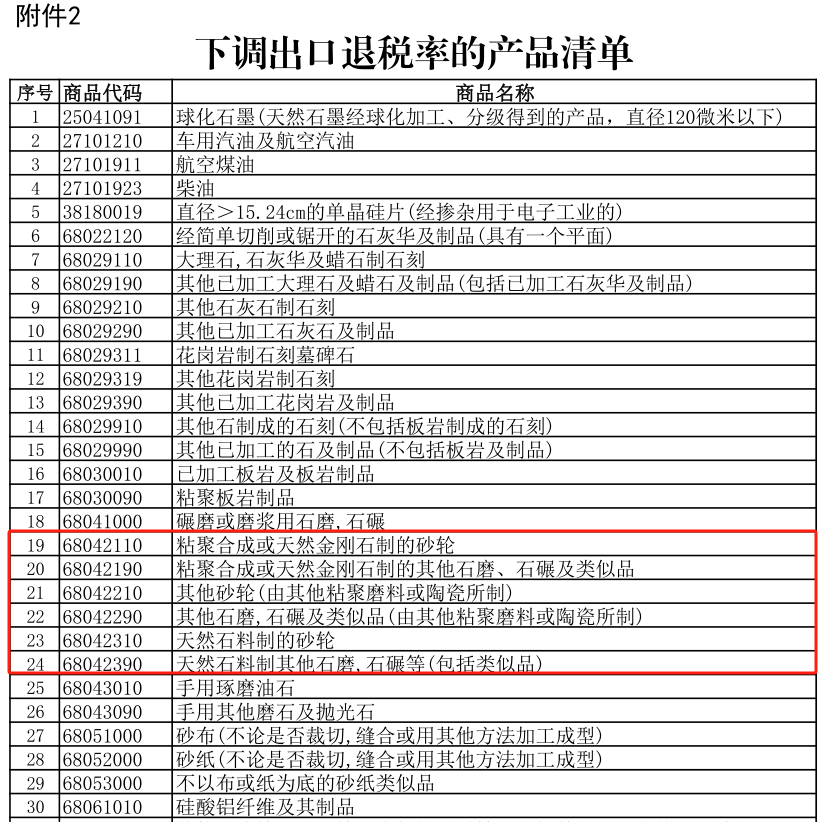 中國(guó)粉體網(wǎng)訊 近期,財(cái)政部、稅務(wù)總局下發(fā)2024年第15號(hào)公告《關(guān)于調(diào)整出口退稅政策的公告》。其中,粘聚合成或天然金剛石制的砂輪、粘聚合成或天然金剛石制的其他石磨、石碾及類(lèi)似品等磨具產(chǎn)品出口退稅率由13%下調(diào)至9%,降幅超過(guò)三成。該公告自2024年12月1日起實(shí)施。