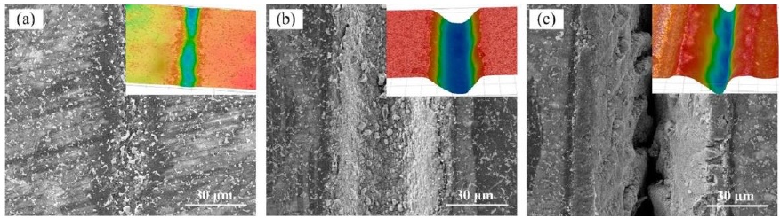 不同激光功率下的激光燒蝕多晶金剛石的形貌圖:(a)5W; (b)12W; (c)18W