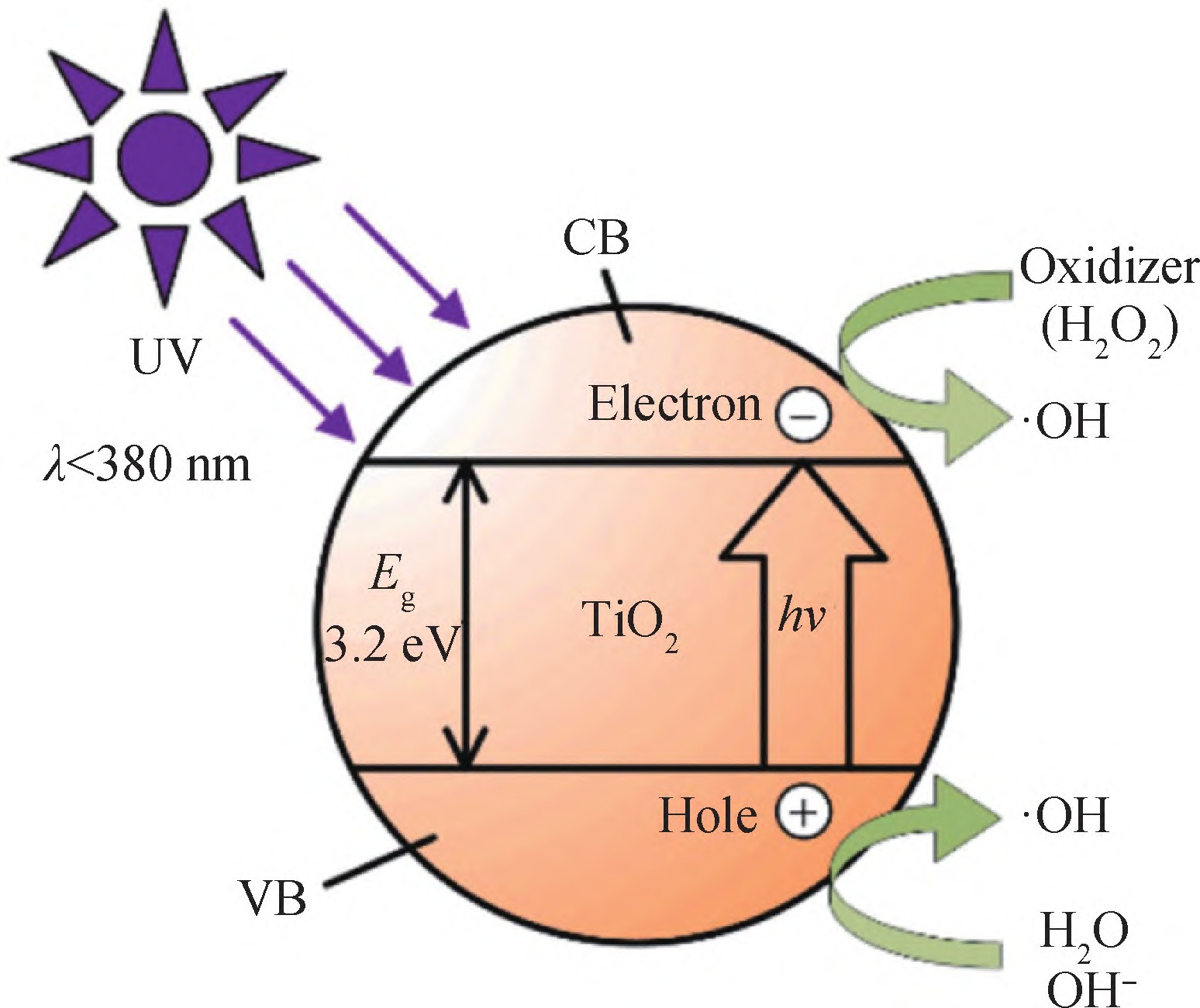 紫外光催化反應(yīng)是一種強(qiáng)氧化反應(yīng),它利用紫外光照射光催化劑和電子捕捉劑發(fā)生光催化反應(yīng),生成具有強(qiáng)氧化性的羥基自由基(•OH)。