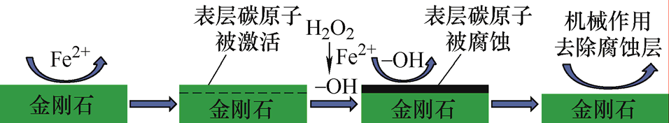 該過程基于芬頓(Fenton)反應(yīng)拋光金剛石,將鐵浸入H2O2溶液中,生成亞鐵離子(Fe2+),F(xiàn)e2+與 H2O2反應(yīng)生成具有強(qiáng)氧化性的•OH,反應(yīng)過程如下: