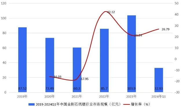 2019年中國金剛石線鋸行業(yè)市場規(guī)模87.52億元,2024年Q1中國金剛石線鋸行業(yè)市場規(guī)模32.93億元,同比增長26.79%。2019-2024 Q1年中國金剛石線鋸行業(yè)市場規(guī)模如下: