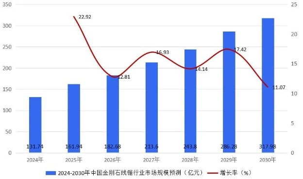 同時(shí),對環(huán)保和可持續(xù)發(fā)展的追求也促使行業(yè)向更綠色環(huán)保的生產(chǎn)方式轉(zhuǎn)型,如開發(fā)可回收利用的線鋸產(chǎn)品,減少生產(chǎn)過程中的廢物產(chǎn)生等。這些努力不僅有助于降低環(huán)境影響,也可能成為企業(yè)新的競爭優(yōu)勢。據(jù)智研瞻預(yù)測,2024-2030年中國金剛石線鋸行業(yè)市場規(guī)模增長率在11%-23%,2030年中國金剛石線鋸行業(yè)市場規(guī)模317.98億元,同比增長11.07%。2024-2030年中國金剛石線鋸行業(yè)市場規(guī)模預(yù)測如下: