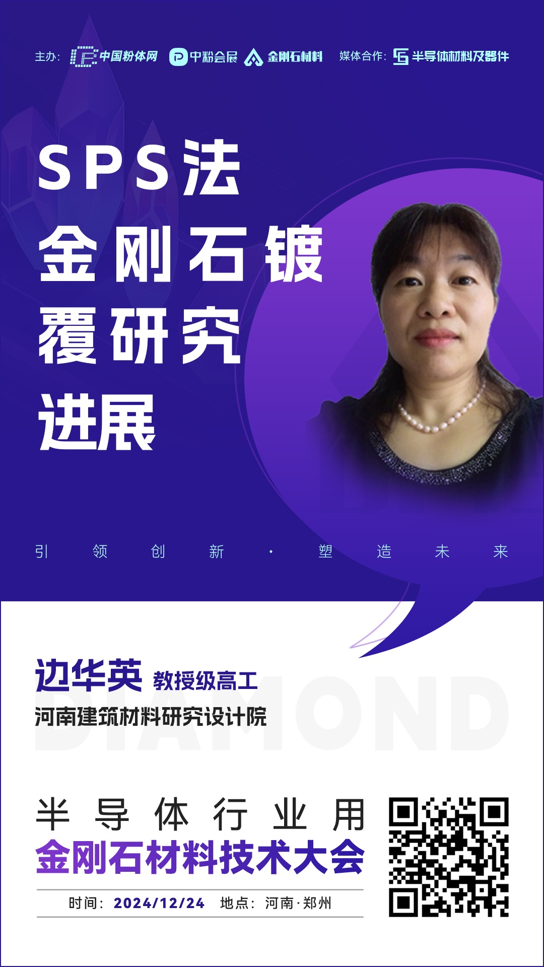 2024年12月24日,中國(guó)粉體網(wǎng)將在河南·鄭州舉辦“2024半導(dǎo)體行業(yè)用金剛石材料技術(shù)大會(huì)”。屆時(shí),我們邀請(qǐng)到河南建筑材料研究設(shè)計(jì)院教授級(jí)高工邊華英出席本次大會(huì)并作題為《SPS法金剛石鍍覆研究進(jìn)展》的報(bào)告,邊華英教授將為您具體介紹SPS法金剛石鍍覆工藝和研究進(jìn)展。