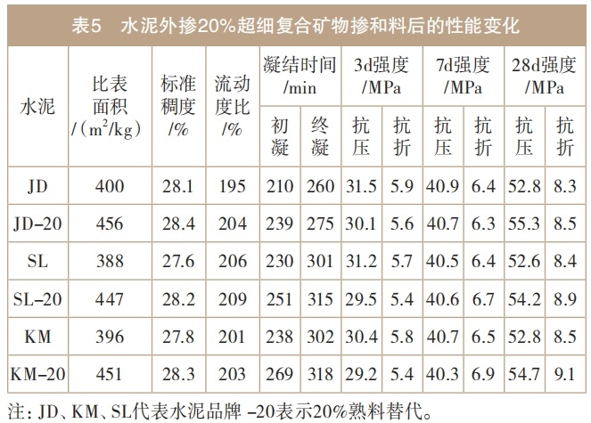 結(jié)果表明:在三家水泥企業(yè)生產(chǎn)的P·O42.5水泥中,摻入20%超細(xì)復(fù)合礦物摻合料取代水泥熟料,28d抗壓強(qiáng)度分別提升4.7%、3.0%和3.6%,28d抗折強(qiáng)度分別提升6.67%、6.0%和7.1%。