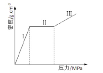 第二階段,被壓縮粉體密度隨壓力增加變化顯著減緩。這一過程粉體顆粒間接觸面積進一步增大,此時會給壓縮過程帶來一定阻力,如顆粒間的摩擦力、由于顆粒嚙合造成的機械結(jié)構(gòu)所導(dǎo)致的機械阻力等。