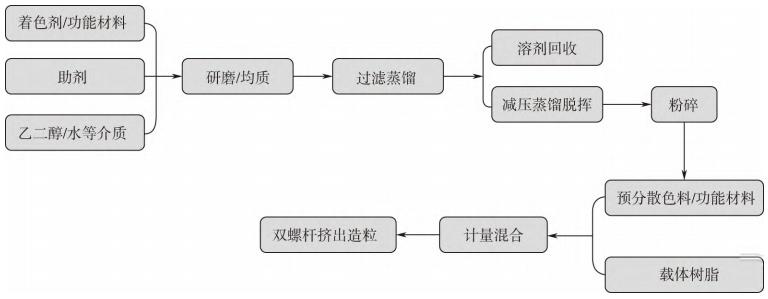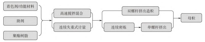 聚酯纖維用母粒(色母粒/功能母粒)的傳統(tǒng)制備方法操作流程簡單、成本低,且具有較大的市場競爭優(yōu)勢,目前國內(nèi)外大部分的聚酯纖維母粒都是采用該方法生產(chǎn)。