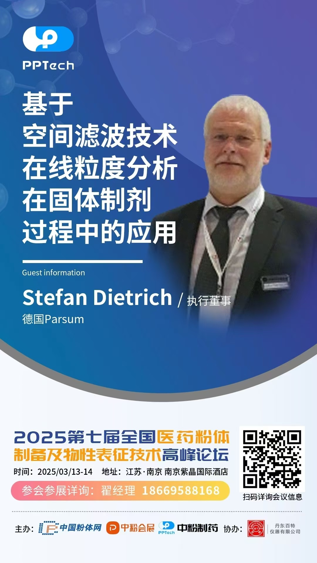 以“從粉體技術(shù),論制藥工藝”為主題,2025年3月13-14日中國粉體網(wǎng)將在江蘇南京紫晶國際酒店舉辦“2025第七屆全國醫(yī)藥粉體制備及物性表征技術(shù)高峰論壇”。屆時來自德國Parsum公司的執(zhí)行董事Stefan Dietrich博士為大家?guī)怼?span style="color: rgb(255, 0, 0);">基于空間濾波技術(shù)在線粒度分析在固體制劑過程中的應(yīng)用》的主題報告。報告主講人將用實(shí)際數(shù)據(jù),展示在線粒度分析在各種造粒設(shè)備上應(yīng)用的重要性和先進(jìn)性。尤其是在一步制;蛉詣舆B續(xù)造粒上,在線粒度分析的重要性。