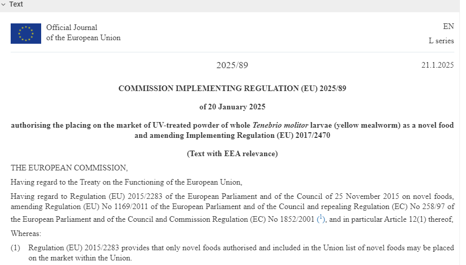 該規(guī)定已經(jīng)于今年2月10日正式施行,我國商務(wù)部也在條令發(fā)布當(dāng)日發(fā)布了例行通告,這場始于歐洲的食品革命,不僅是技術(shù)的進(jìn)步,更是人類重塑食物系統(tǒng)的必然選擇——當(dāng)4%的面包蟲粉悄然進(jìn)入早餐,我們正見證著一場靜默的可持續(xù)未來餐桌革命。