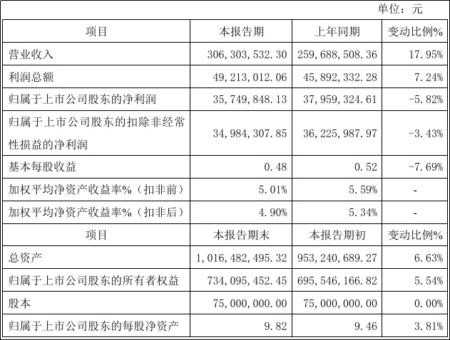 報告期內(nèi),公司預(yù)計實現(xiàn)營業(yè)收入30,630.35萬元,同比上升17.95%;歸屬于上市公司股東的凈利潤3,574.98萬元,同比下降5.82%;歸屬于上市公司股東扣除非經(jīng)常性損益的凈利潤3,498.43萬元,同比下降3.43%;基本每股收益預(yù)計0.48元,同比減少7.69%。